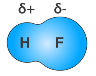 دو انتهای مثبت و منفی این مولکولها با نام قطب شناهته میشوند. این قطب ها همانند قطب منفی و مثبت آهنربا هستند و میتوانند در میدان الکتریکی و مغناطیسی بچرخند و تغییر جهت بدهند. مولکولی که دو قطب دارد، مولکول دوقطبی نامیده می شود. برای مثال، مولکولی مانند هیدروژ» فلوئورید، یک مولکول و قطبی است. ساختار این مولکول را در تصویر زیر مشاهده میکنید. در مولکولهای قطبی، سمتی از مولکول که بار جزئی منفی دارد با علامت () و سری که بار مثبت دارد با علامت () نشان داده میشود.