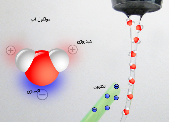 این بالن یا شانه که دارای الکتریسیته ساکن هستند،، میتوانند باریکه ای نازک از آب را به خود جذب کنند زیرا آب مولکولی قطبی است و در میان الکتریکی جهتگیری میکند.