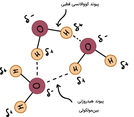 مولکولهای آب به دلیل قطبیتی که دارند همدیگر را جذب میکنند. یک سر مثبت یکی از مولکولهای آب به سر منفی مولکول آب دیگر به وسیله نیروی واندروالسی هیدروژنی متصل میشود. پیوند هیدروژنی پیوندی ضعیف از نوع نیروهای بینمولکولی است که در آن یک هیدروژن توسط این پیوند به یک اتم الکترونگاتیوتر مانند اکسیژن، نیتروژن یا فلوئور متصل میشود.