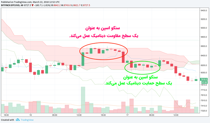 اما چگونه می‌توان این خطوط را در معاملات به کار گرفت؟ سنکو اسپن به عنوان سطح حمایت و مقاومت دینامیکی عمل می‌کند. اگر قیمت بالاتر از محدوده سنکو باشد، خط بالا به عنوان حمایت اول عمل می‌کند و خط پایین به عنوان حمایت دوم. اگر قیمت زیر سنکو اسپن باشد، خط پایین به عنوان مقاومت اول عمل می‌کند و خط بالا به عنوان مقاومت دوم.