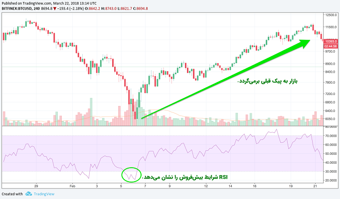 در مثال زیر، RSI در ۱ تا ۲ فوریه شرایط بیش‌فروش را نشان داده است. این زمان موقعیت‌ها برای خرید مناسب به نظر رسیده‌ است. اما معلوم شده که این نظر صحیح نیست و برگشت می‌خورد.