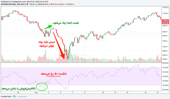ابتدا، قیمت شروع به زیاد شدن می‌کند، اما RSI در ۴ فوریه موفق به شکست ۵۰ نشده و مشاهده می‌کنید که پس از آن چه چیزی رخ داده است. بازار سقوط کرده و به پایین‌تر از ۶۰۰۰ دلار رسیده است. در مثال قبلی روند صعودی، مشاهده می‌کنیم که RSI موفق به شکست ۵۰ شده، با اینکه تقریباً یک هفته در آن محدوده بوده است.