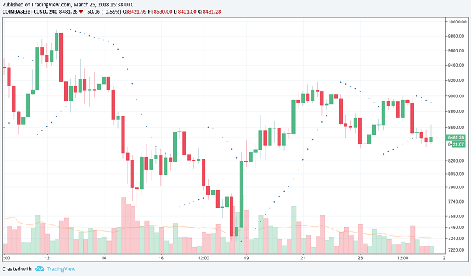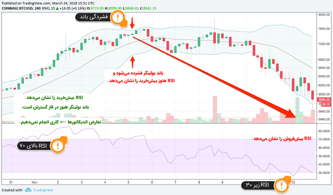 در اواخر اکتبر سال ۲۰۱۷، RSI شروع به نشان دادن بیش‌خرید کرده است. این موضوع ممکن است شما را به فروش وادار کند! اما باندهای بولینگر هنوز در حال گسترش بوده‌اند. RSI از ابتدای ماه نوامبر به نشان دادن شرایط بیش‌خرید ادامه می‌دهد و بازار تا این زمان همچنان با این وضعیت ادامه داشت. باندهای بولینگر شروع به نزدیک شدن کرده‌اند و نشان می‌دهد که بازار در حال آرام شدن است.