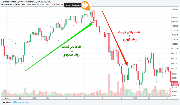 توقف و بازگشت سهموی یک شاخص روند است. در این اندیکاتور، نقاطی روی نمودار در بالا یا پایین قیمت قرار داده می‌شوند که نشان دهنده جهت بالقوه حرکت قیمت هستند. اما چگونه می‌توان از چنین شاخص ساده‌ای در تجارت استفاده کرد؟ هنگامی که نقاط بالاتر از قیمت هستند، بازار در حال نزول است و این نشان می‌دهد که باید سهمتان را بفروشید. وقتی نقاط پایین‌تر از قیمت هستند، بازار در حال صعود است و این نشان می‌دهد که باید سهم را بخرید.
