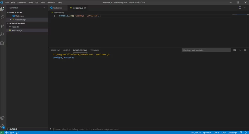 بعد از ساخت پوشه نوبت به انتخاب ویرایشگر کدی مناسب است که در این مثال از «Visual Studio Code» استفاده خواهد شد و با این حال از هر ویرایشگر کد مناسب دیگری هم میتوان برای این هدف استفاده کرد. با گذراندن دو مرحله بالا اکنون میتوان شروع به نوشتن برنامه نود جی اس کرد.