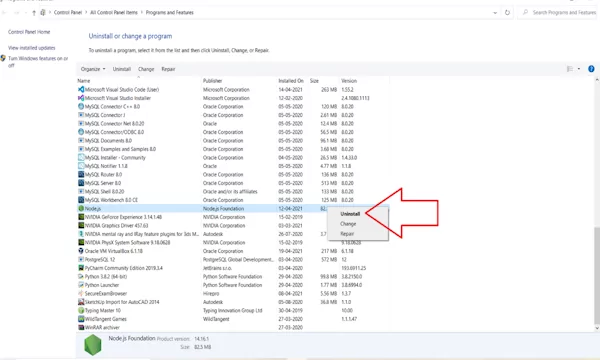 مرحله ۲. کلیک راست روی آیکون برنامه نود جی اس و انتخاب گزینه «حذف نصب» (Uninstall) طبق تصویر زیر: