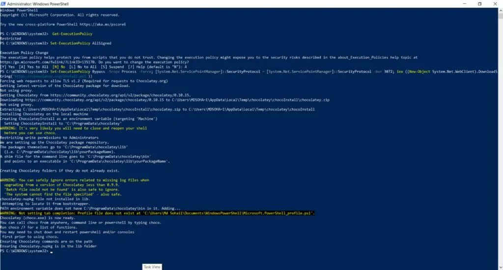 با زدن دکمه «Y» به عنوان قبول شرایط، این دستور خطمشی اجرا را روی «AllSigned» تنظیم میکند که امکان اجرای اسکریپتهای مختلف را فراهم کرده و به افزایش امنیت سیستم کمک میکند. با انجام این مراحل، سیاست اجرا را در «Windows PowerShell» تنظیم خواهد شد تا نصب بستهها از جمله Chocolatey فعال شود. در این مرحله صفحهای با تغییرات سیاست اجرا دریافت خواهد شد که باید گزینه «A (Yes to all)» را انتخاب کرده و دکمه Enter را زد. حال باید در ادامه ماجرا دستور زیر را کپی و پیست کرد: