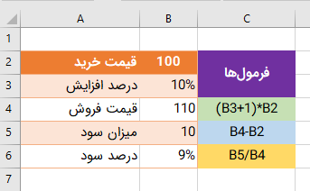 همانطور که در تصویر مشاهده میکنید، در ستون سوم، فرمولهای مربوط به هر یک از سلولهای محاسباتی نوشته شده است. برای محاسبه قیمت فروش (یک سلول وابسته) از فرمول زیر کمک گرفتهایم.