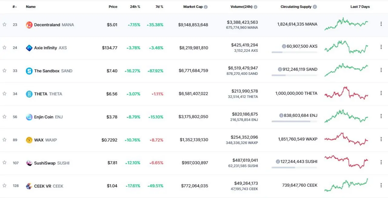 شما میتوانید از سایتهای مختلفی مانند «کوینمارکتکپ» و «کوینجکو» برای مشاهده فهرست ارزهای دیجیتال متاورس استفاده کنید. برای این کار کافی است از بخش «Categories» این دو سایت گزینه «Metaverse» را انتخاب کنید. در حال حاضر بیش از 140 پروژه ارز دیجیتال متاورس در کوینمارکتکپ فهرست شده که در تصویر زیر میتوانید پروژههای برتر آن را بر اساس ارزش بازار مشاهده کنید.