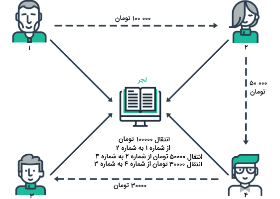 - بلاک چین به صورت یک دفتر کل توزیع شده عمل میکند. در سیستم مالی سنتی، اطلاعات حسابها در یک پایگاه داده قرار دارد که مدیریت آن پایگاه داده بر عهده نهاد مرکزی است. در سیستم غیرمتمرکز ارز دیجیتال برای این که امنیت حفظ و نگهداری اطلاعات بالا باشد، یک نسخه از اطلاعات در اختیار همه کاربران شبکه قرار میگیرد. کاربران با استفاده از این اطلاعات میتوانند صحت تراکنشها را تایید کنند و بر سر انجام آنها به اجماع برسند.