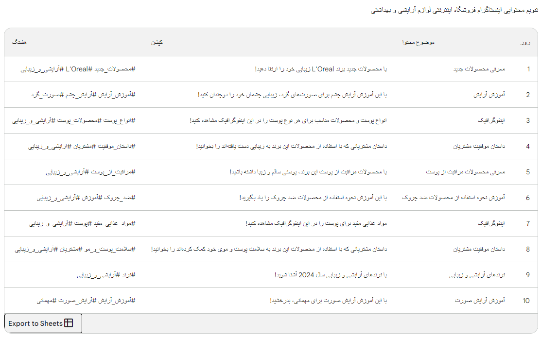 در حال ایدهآل یک تقویم محتوایی باید جدول زمانی مرکزی باشد که محتوای در دست تولید تمام پلتفرمهایی را که برای انتشار محتوا انتخاب کردهاید به اعضای تیم نشان میدهد. پس جدول زمانی را در نظر بگیرید که سطر و ستونهای آن به روز هفته، تاریخ، زمان انتشار پست، نوع محتوا، کانال انتشار و دیگر موارد مهم اختصاص پیدا کرده است. در نمونه زیر از هوش مصنوعی بارد خواستیم یک تقویم محتوایی برای فروشگاه لوازم آرایشی و بهداشتی تنظیم کند: