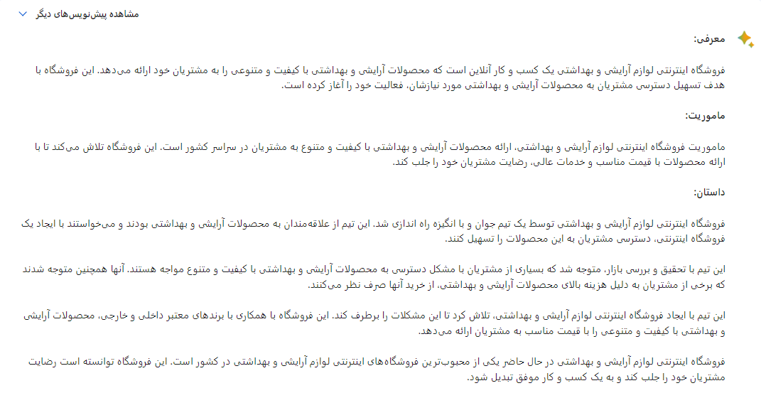 اگر در ابتدای کار هستید، میتوانید از ابزارهای مختلف هوش مصنوعی برای نوشتن معرفی، داستان و ماموریت برند کمک و ایده بگیرید. مانند نمونه زیر که در آن از هوش مصنوعی گوگل بارد خواستیم ماموریت و اهداف فروشگاه لوازم آرایشی و بهداشتی فرضی ابتدای مطلب را برای تدوین سند استراتژی بازاریابی محتوا برای ما بنویسد: