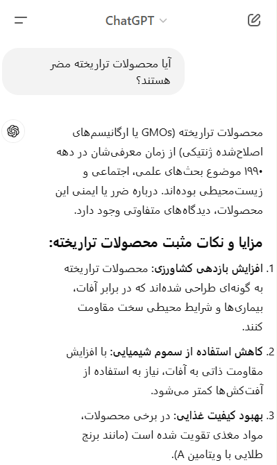 به این شکل میتوانید بدون نیاز به کلیک روی لینکهای مختلف و بررسی مطالب مختلف برای رسیدن به جواب درست، درباره هر مطلبی تحقیق و اطلاعات کسب کنید. در ادامه میبینید که پاسخ این ربات به سوال رایج درباره مضر بودن محصولات تراریخته، چه بوده است.