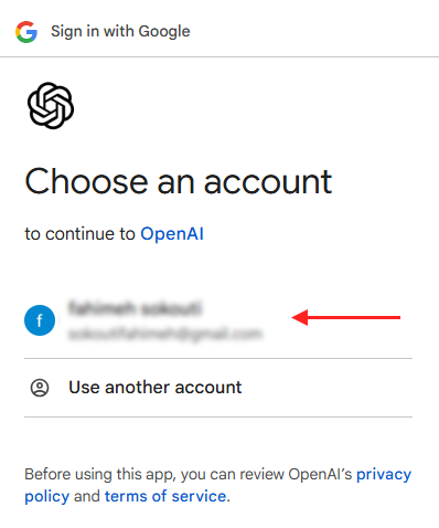 صفحه جدیدی مشابه تصویر آورده شده در ادامه باز میشود. در این صفحه میتوانیم اکانت گوگل - که حال حاضر در آن لاگین هستیم - را انتخاب کنیم یا با انتخاب گزینه Use another account وارد گوگلاکانت دیگری شویم.