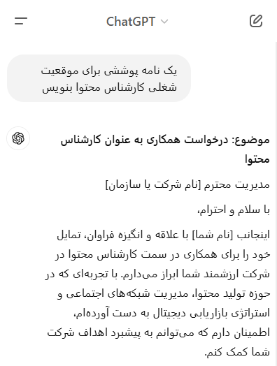 یکی از مهمترین کاربردهای تولید محتوا در رزومه نویسی یا نگارش معرفی نامه یا «نامه پوششی» (Cover Letter) است. به کمک چت جی پی تی میتوانید چارچوبی کامل از آنچه در ذهن دارید را دریافت کنید که هرچند جای بهبود فراوان دارد اما تا حد زیادی در وقتتان صرفهجویی میکند. در ادامه مثالی از درخواست نوشتن نامه پوششی برای موقعیت شغلی کارشناس محتوا را میبینیم.