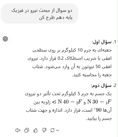 در مثال زیر متنی از فیزیک پایه دهم را برای این ربات فرستاده و خواستهایم تا دو سوال از روی آن طرح کند.