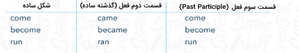 برخی از افعال بی قاعده در زبان انگلیسی شکل ساده و شکل سوم یکسانی دارند، اما شکل گذشته برای آنها متفاوت است. برای مثال شکلهای مختلف فعل «run» به صورت زیر تعریف میشود: