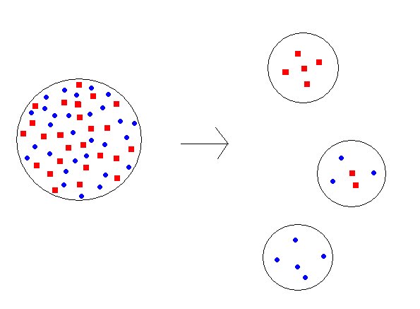 در شکل زیر جمعیتی را میبینید که از تعداد مساوی مربع و دایره تشکیل شده است. (فرض کنیم شکل یک فرد توسط آللهای آن برای یک ژن خاص تعیین میشود). گروههای تصادفی که برای ایجاد کلنیهای جدید عزیمت میکنند، احتمالاً دارای تعداد متفاوتی از مربعها و دایرهها نسبت به جمعیت اصلی هستند. بنابراین، فراوانی آلل در کلنیها (دایرههای کوچک) ممکن است نسبت به جمعیت اصلی متفاوت باشد. همچنین، اندازه کوچک کلنیهای جدید به این معنی است که آنها رانش ژنتیکی قوی را برای نسلها تجربه خواهند کرد.