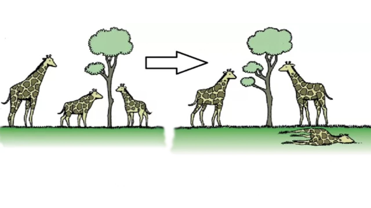 اگر 1000 زرافه را بردارید و گردن آنها را اندازه بگیرید، همه آنها کمی با یکدیگر متفاوت خواهند بود. این تفاوتها حداقل تا حدی توسط ژنهای آنها تعیین میشود. آنهایی که گردن بلندتری دارند ممکن است به نسبت بیشتری فرزندان بیشتری از خود به جای بگذارند، زیرا بهتر تغذیه کردهاند و شاید در رقابت برای جفت بهتر عمل کردهاند، زیرا قویتر هستند. سپس، اگر بخواهید گردنهای نسل بعدی را اندازه بگیرید، آنها نیز متفاوت خواهند بود، اما میانگین کمی به سمت گردنهای بلندتر تغییر میکند. این روند نسل به نسل ادامه دارد.