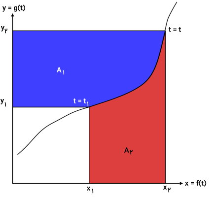 نمایش تصویری مفهوم انتگرال جز به جز (در بخش اثبات فرمول انتگرال جز به جز، به تفسیر این نمودار خواهیم پرداخت.)
