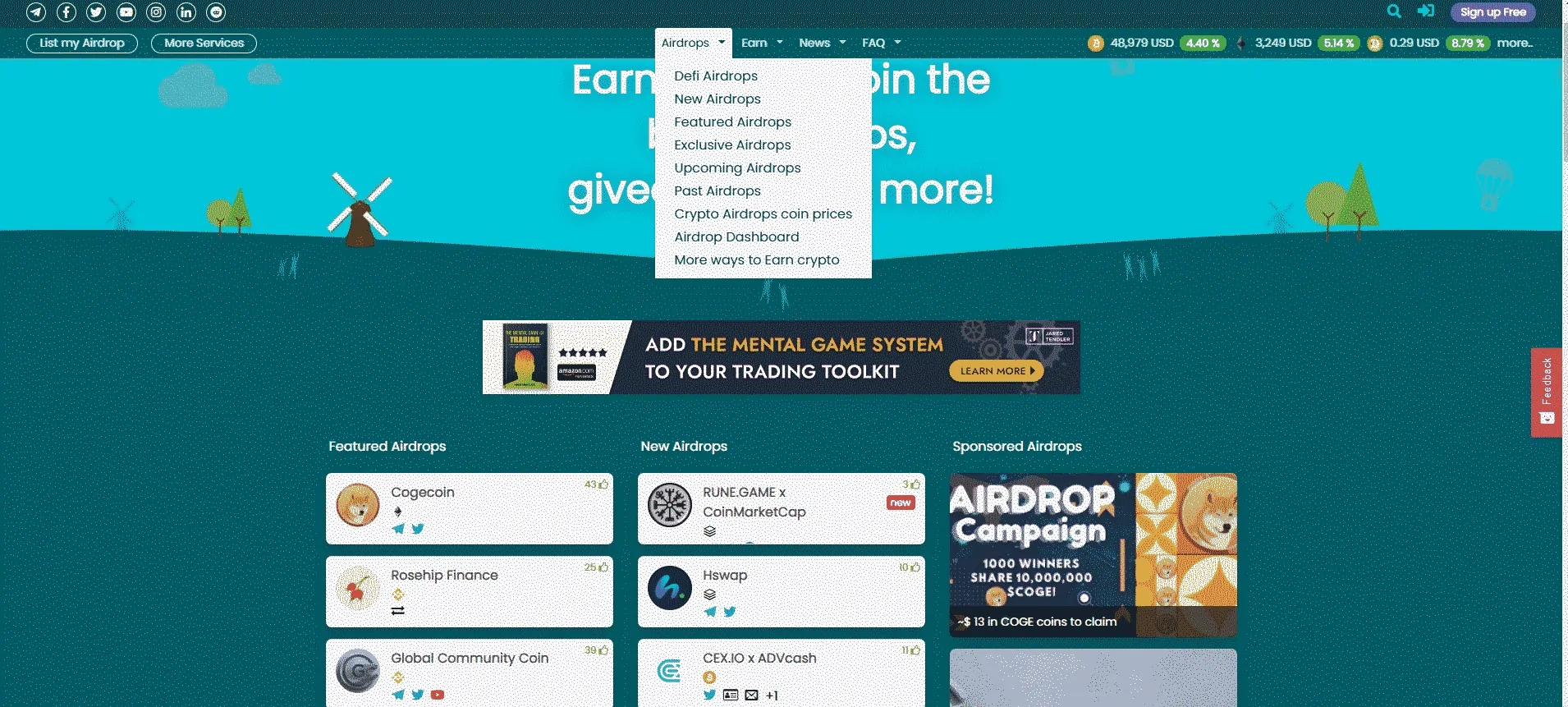 سایت «کوین مارکت کپ» یکی از معروفترین سایتها در حوزه آموزش ارزهای دیجیتال است. در این سایت میتوانید اطلاعات زیادی از وضعیت بازار و پروژههای مختلف به دست آورید. در قسمت «Calendars» این سایت، با مراجعه به قسمت Free Airdrops میتوانید لیست آخرین ایردراپها را مشاهده کنید.