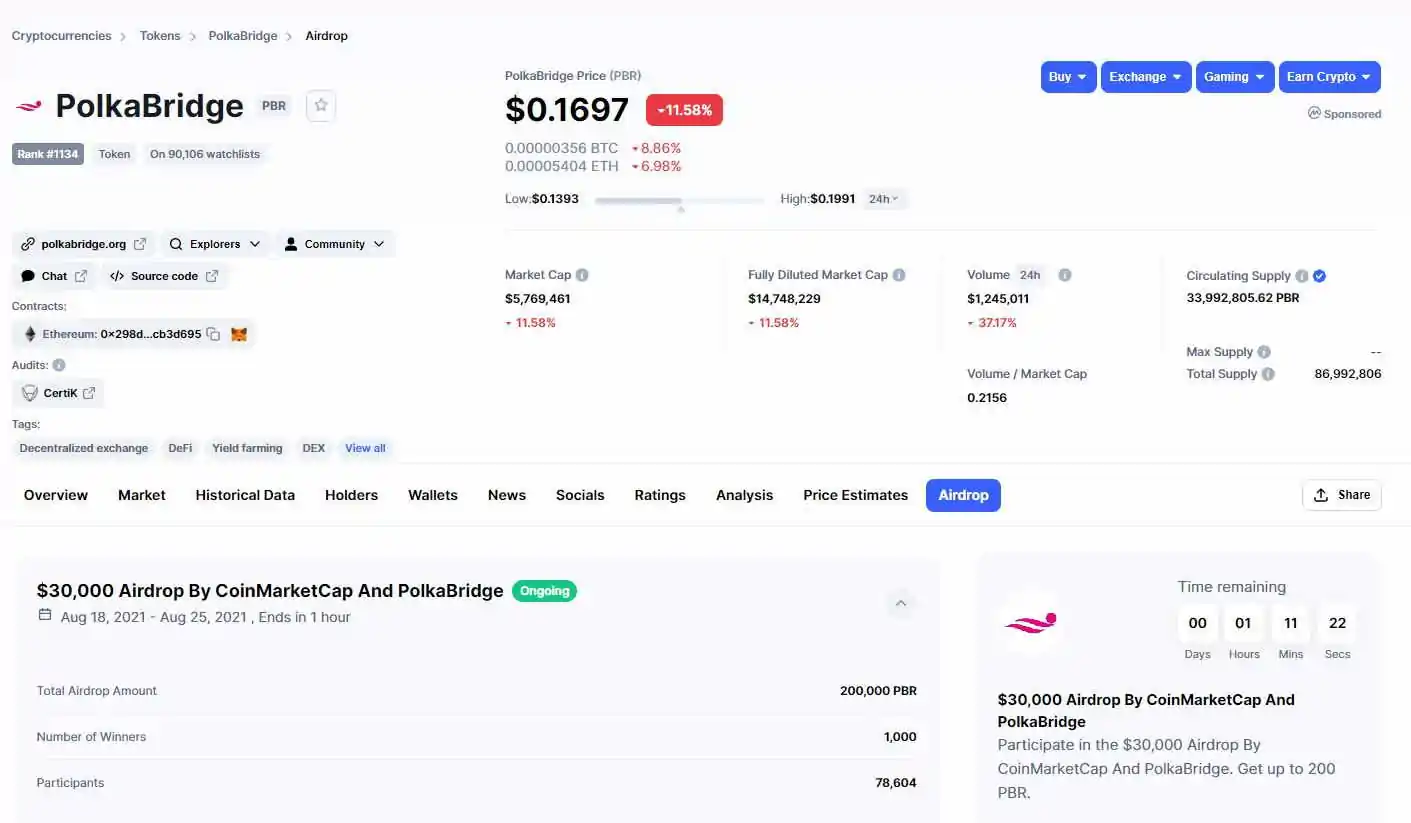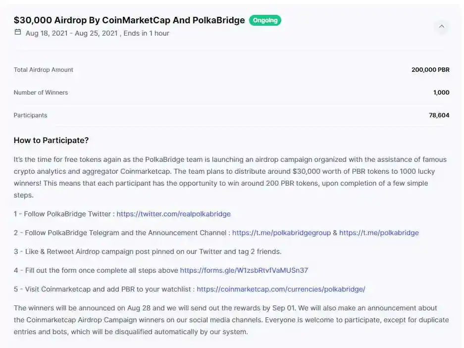 این ایردراپ از 18 تا 25 آگوست 2021 برگزار میشود و برندگان آن 28 آگوست مشخص خواهد شد. واریز توکن به کیف پول برندگان، یکم آگوست انجام خواهد شد.