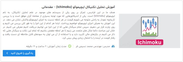 برای آشنایی بیشتر با مفهوم ایچیموکو در تحلیل تکنیکال می‌توانید به آموزش بالا مراجعه کنید. این آموزش توسط «فرادرس» و در قالب دوره‌ای ۶ ساعته و در ۵ درس تدوین شده است. در این آموزش در درس اول مبانی اولیه آموزش داده می‌شود. درس دوم به معرفی اِلِمان‌های ایچیموکو اختصاص یافته است. دروس سوم و چهارم به ترتیب به سیگنال‌های ابر کومو و سیگنال‌های تنکان و کیجون می‌پردازند. در نهایت، سیگنال‌های چیکو‌اسپن در درس پنجم آموزش داده می‌شوند.