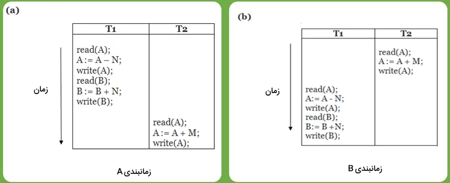 همانطور که در تصویر مشاهده میکنید، «زمانبندی A»، زمانبندی سریالی را نشان میدهد که در آن ابتدا «T1» و سپس «T2» اجرا میشود. «زمانبندی B» نیز، زمانبندی سریالی را نشان میدهد که در آن ابتدا عملیات مربوط به «T2» و سپس عملیات «T1» اجرا میشود.