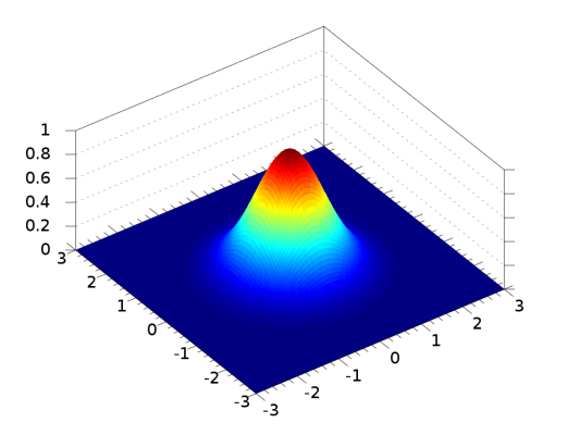 در رابطه ۳، پارامتر ، ارتفاع نمودار و نقطه مختصات مرکز نمودار را مشخص میکند. از طرفی گسترش دمهای نمودار نیز توسط دو پارامتر و مشخص میشود. در تصویر زیر نموداری از توزیع گاوسی دو متغیره را مشاهده میکنید که در آن مرکز برابر است با ، و در نظر گرفته شده است که به نوعی پهنای نمودار را نشان میدهد.
