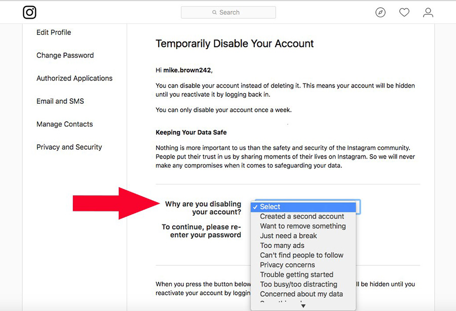 زمانی که به صفحه مورد نظر رسیدید، دلیل غیر فعال ساختن اکانت خود را از لیست بازشوی حاضر انتخاب کنید.