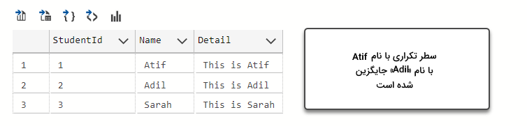 در این نوبت، ردیف مربوط به دانشجو Atif را بهصورت تکراری نمیبینیم. دفعه پیش این ردیف دوبار تکرار شده بود. زیرا اینبار درحال نگاه کردن به نامهای «غیرتکراری» (Distinct) هستیم چون دستورDISTINCT را روی مقادیر مربوط به ستون Name اعمال کردهایم و بهعنوان نتیجه، از نمایش ردیفهای تکراری در مجموعه نتایج جلوگیری کردهایم. البته این اتفاق بر روی جدول موقتی رخ میدهد، که از نتیجه کوئریها حاصل میشود.