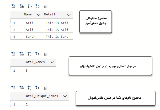 بهوضوح از خروجی کوئری مشخص است که نسبت به تعدادی که انتظار داریم -توقع ظاهر شدن ۳ عدد رکورد را داریم- تعداد نامهای منحصربهفرد کمتری، در واقع ۲ نام غیرتکراری، وجود دارند. اگر تصور کنیم این دادهای است که به اشتباه 2 بار در پایگاه داده ما درج شده پس حتما بر روی نتایج تحلیل ما تاثیر منفی خواهد داشت.