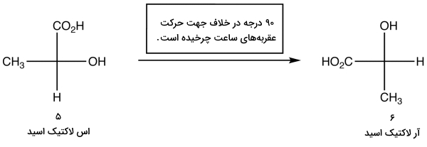 - توجه داشته باشید که اگر به مولکولی برخورد کردید که استخلاف با اولویت بالا در پشت صفحه و استخلاف با اولویت پایین در روی صفحه قرار داشت، پیش از رسم فلش باید مولکول را بچرخانیم.