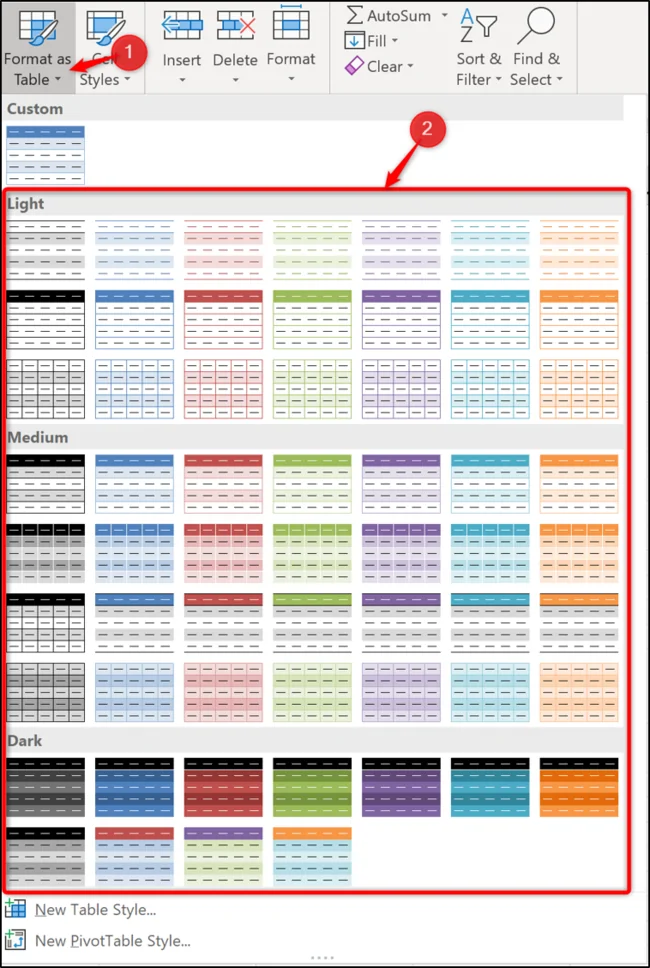 سپس روی دکمه Format as Table در زبانه Home کلیک کنید و در ادامه سبک جدولی که می‌خواهید استفاده کنید را انتخاب نمایید.