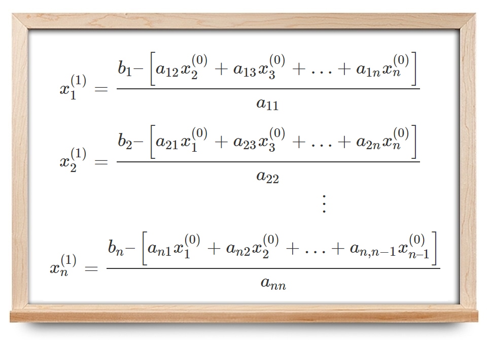 x1=b1[a12x2+a13x3+...+a1nxn]a11x2=b2[a21x1+a23x3+...+a2nxn]a22xn=bn[an1x1+an2x2+...+an,n1xn1]ann\large \begin {align} x _ 1 = \frac { b _ 1 - \left [ a _ { 1 2 } x _ 2 + a _ { 1 3 } x _ 3 + ... + a _ { 1 n } x _ n \right ] }{ a_ { 1 1 } } \\ x _ 2 = \frac { b _ 2 - \left [ a _ { 2 1 } x _ 1 + a _ { 2 3 } x _ 3 + ... + a _ { 2 n } x _ n \right ] } { a _ { 2 2 } } \\ \quad \quad \quad \quad\quad \quad \vdots \quad \quad \quad \quad \quad \quad \\ x _ n = \frac { b _ n - \left [ a _ { n 1 } x _ 1 + a _ { n 2 } x _ 2 + ... + a _ { n , n - 1 } x _ { n - 1 } \right ] } { a _ { n n } } \end {align}