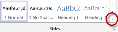 نرمافزار ورد، چندین گزینه استایل داخلی دارد که میتوانند برخی از نیازهای مربوط به قالببندی را حل کنند. در ابتدا پاراگراف یا متنی که میخواهید استایل روی آن اعمال شود را انتخاب کنید. سپس در زبانه Home، روی فلش سمت راست پایین گروه Styles بزنید.
