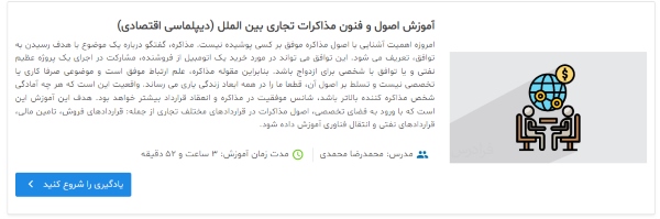 مجموعه فرادرس در فیلم‌هایی با مدت زمان ۳ ساعت و ۵۲ دقیقه، به تشریح آن چیزی پرداخته که باید راجع به اصول و فنون مذاکره و همینطور عوامل موثر بر مذاکره بدانید. فیلم آموزش اصول و فنون مذاکرات تجاری بین‌المللی فرادرس در قالب ۱۰ درس ارائه شده و با پوشش دادن موضوعاتی مانند تعاریف و مهارت های مذاکره، پیش‌نیازهای مذاکره، ریسک در قراردادها، مذاکرات فروش، مذاکرات انتقال فناوری و مذاکرات تامین مالی، گزینه‌ای عالی برای علاقه‌مندان به رشته‌های گوناگون نظیر حقوق تجاری، روابط بین‌الملل، حقوق بین‌الملل، تجارت و مدیریت تلقی می‌شود.
