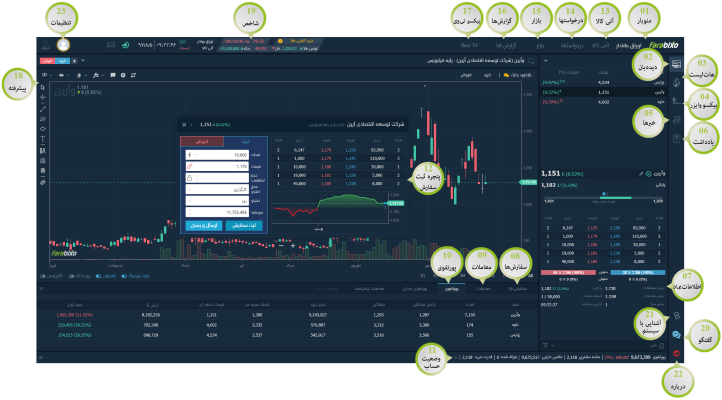 شکل زیر نمای کلی سامانه معاملاتی فارابیکسو را نشان میدهد که بخشهای مختلف روی آن مشخص شدهاند و توضیحات روی تصویر گویای بخش مربوطه است.