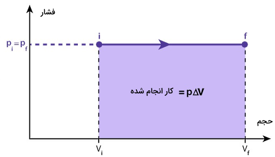 مسیر تا در این نمودار فشار بر حسب حجم، معادل یک فرآیند انبساط همفشار است. سیستم در این مسیر دارای فشار ثابت است و حجم آن از تا افزایش یافته است. بنابراین کار انجام شده در این مسیر به کمک فرمول کار برای فرآیند هم فشار که در بخشهای قبل توضیح داده شد، محاسبه میشود: