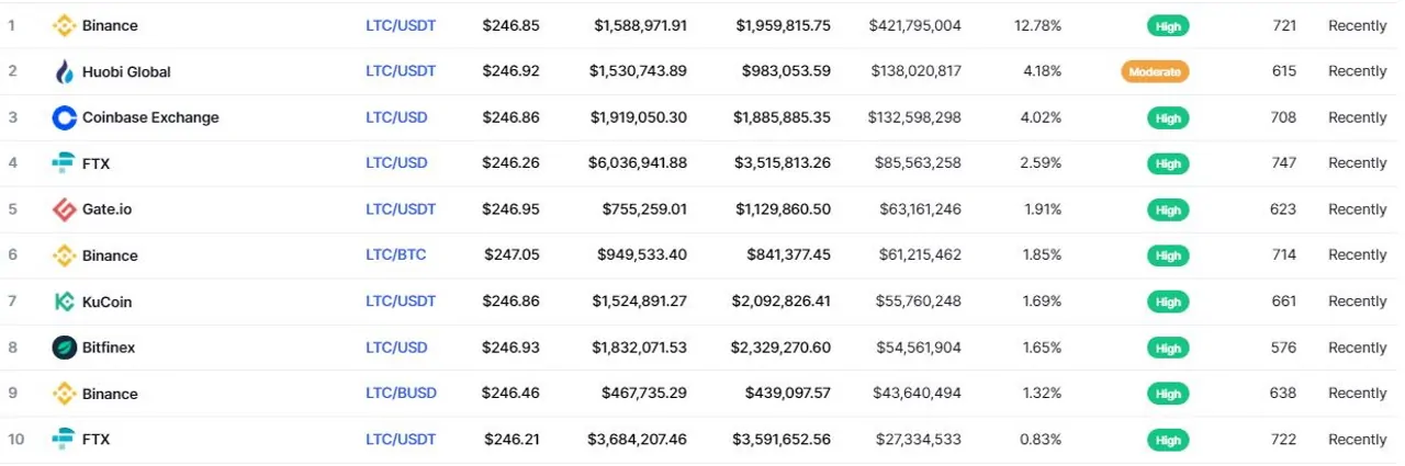 علاوه بر صرافیهای بینالمللی متمرکز، بسیاری از صرافیهای ایرانی نیز از معاملات لایتکوین پشتیبانی میکنند. بنابراین، شما میتوانید بدون تحمل دردسرهای مربوط به صرافیهای خارجی به خرید و فروش لایتکوین در کنار سایر کوینها و توکنها بپردازید. برای مشاهده لیست صرافیهای پشتیبان این رمزارز میتوانید از سایت «کوینمارکتکپ» و برای مشاهده و تحلیل نمودارهای قیمتی لایتکوین میتوانید از وبسایت «تریدینگ ویو» استفاده کنید. تصویر زیر لیست برخی از صرافیهای پشتیبان لایتکوین را نشان میدهد.