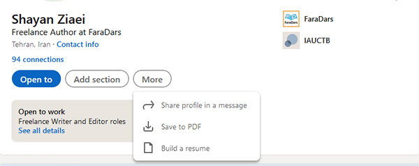 - ساخت پروفایل حرفهای در لینکدین (با امکان افزودن سوابق کاری، تحصیلی، مهارتها و علاقهمندیها)
