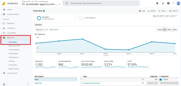رباتهای جستجو صفحات یتیم وبسایت را بهسختی پیدا میکنند بنابراین همین ابتدای کار بسیار مهم است که فهرستی از صفحات فعلی وبسایت (صفحات نمایهگذاری شده) پیدا کنید. انجام این کار با گوگل آنالیتیکس بسیار آسان است. در داشبورد اصلی آنالیتیکس به بخش Behavior در نوار کناری بروید: