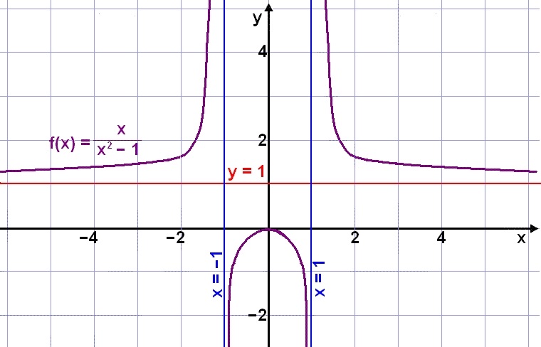 میبینیم که اگر ، کسر صفر شده و تابع به خط میل میکند. شکل زیر میل تابع به مجانب را بهخوبی نشان میدهد. خطوط قرمز رنگ، مجانبهای قائم و مایل تابع هستند.