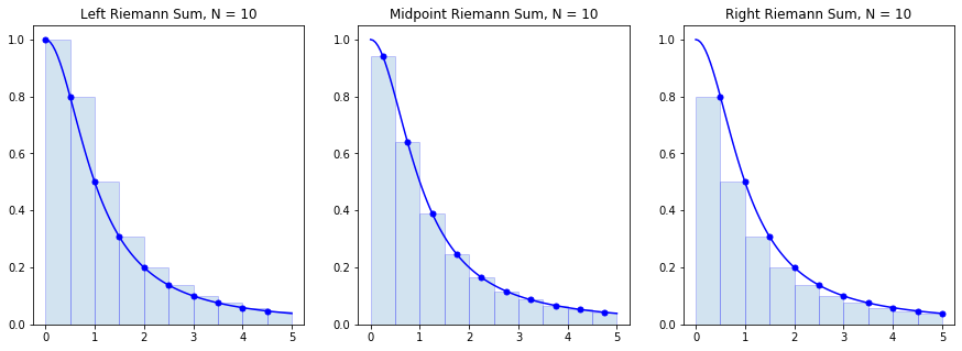 که در آن، Δx=(b−a)/N و xi=a+iΔx افرازی با N زیربازه به طول مساوی را نشان میدهد. همچنین، method مشخص میکند که یکی از نقاط انتهایی چپ (مجموع ریمان چپ)، نقاط انتهایی راست (مجموع ریمان راست) یا نقاط میانی (مجموع ریمان نقطه میانی) استفاده شود. روش پیشفرض نقطه میانی است.