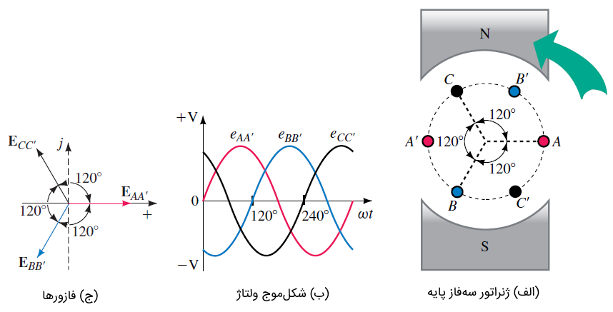 اگر دو سیمپیچ دیگر به شکل ۱ اضافه کنیم، دو ولتاژ دیگر نیز تولید میشود (شکل ۲). از آن جایی که این سیم پیچها مشابه هستند (تفاوت آنها فقط در موقعیت روی رتور است)، ولتاژهای یکسانی تولید میکنند. هرچند، چون سیمپیچ بهاندازه عقبتر از سیمپیچ است، ولتاژ بهاندازه از عقبتر خواهد بود. بهطریق مشابه، سیمپیچ که جلوتر از سیمپیچ است، ولتاژ را تولید میکند که بهاندازه پیشفاز است. شکلموجها در شکل ۲ (ب)، و فازورها در شکل ۲ (ج) نشان داده شدهاند. همانگونه که مشخص است، اندازه ولتاژها برابر است و زاویه آنها به اندازه با هم تفاوت دارد.