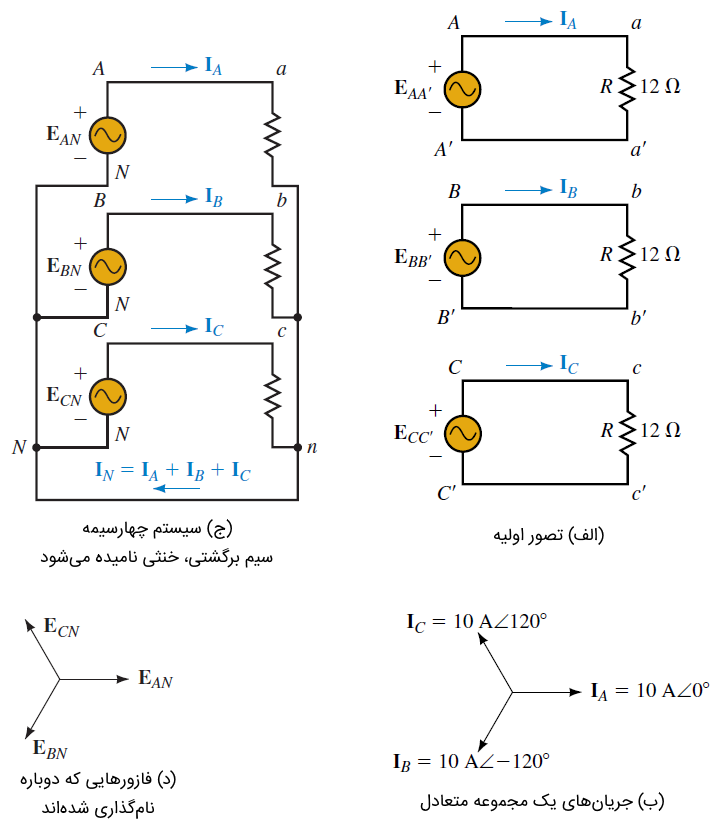 جریانهای فوق، مطابق شکل ۳ (ب)، یک مجموعه متعادل را تشکیل میدهند.