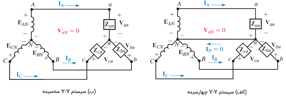 همانگونه که از شکل ۴ (الف) مشخص است، یک مدار Y-Y یا ستاره-ستاره داریم که بهعنوان یک سیستم Y-Y چهارسیمه شناخته میشود. با کمی تغییر میتوان مطابق شکل ۴ (ب) به یک سیستم Y-Y سهسیمه رسید.