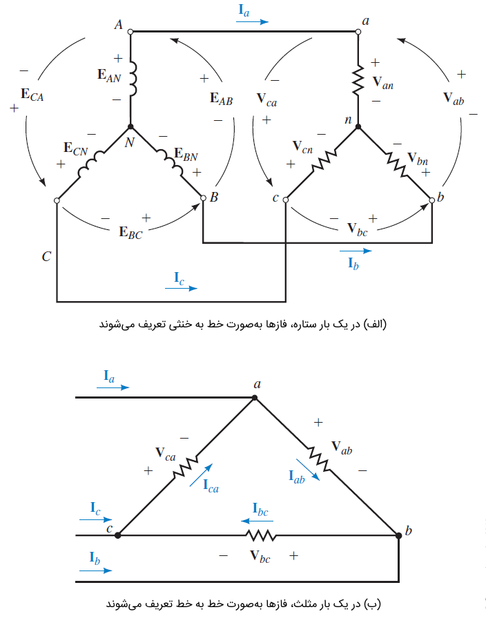 ولتاژهای فاز، ولتاژ فازها هستند. در یک بار Y، ولتاژ فاز، بهعنوان اختلاف ولتاژ خط تا خنثی تعریف میشود (شکل ۷ (الف)). بنابراین، ، و ولتاژهای فاز یک بار Y هستند. برای بار ، فازها مطابق شکل ۷ (ب)، بهصورت خط به خط بیان میشوند. همانطور که میبینیم، ولتاژهای فاز و خط در یک بار مشابه هستند. برای ژنراتور شکل ۷ (الف)، مقادیر ، و ولتاژ فاز هستند.