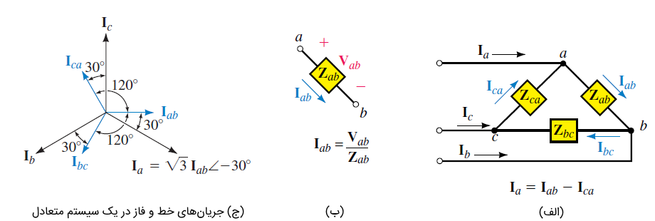 بار مثلث شکل ۱1 را در نظر بگیرید. جریان فاز را میتوان مطابق قسمت (ب) این شکل بهدست آورد: