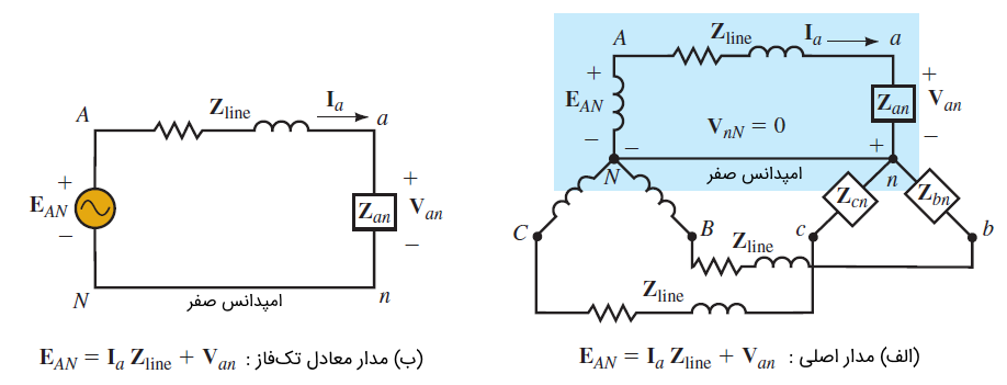 با توجه به نکاتی که گفتیم، واضح است اگر حل یک فاز سیستم سهفاز متعادل را داشته باشیم، میتوانیم بهسادگی کمیتهای سه فاز دیگر را بهدست آوریم. این گفته را میتوان در قالب روش مدار معادل تکفاز برای سیستمهای متعادل بیان کرد. یک سیستم Y-Y را با امپدانس خط در نظر بگیرید. سیستم ممکن است سهسیمه یا چهارسیمه با امپدانس هادی خنثی باشد. در هر دو حالت، از آنجایی که ولتاژ بین نقاط خنثی صفر است، میتوان نقاط و را با یک هادی با امپدانس صفر به یکدیگر متصل کرد، بدون اینکه ولتاژ یا جریان در هر جای مدار دچار تغییر شود. این موضوع، در شکل ۱2 (الف) نشان داده شده است.